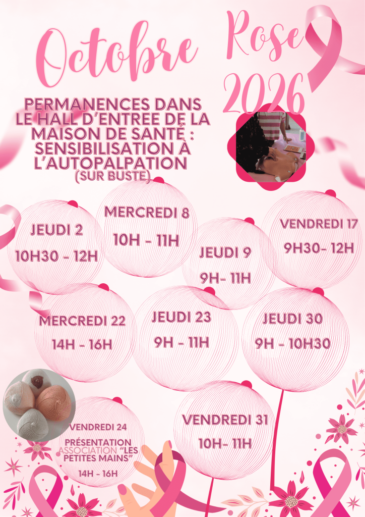 La Maison de Santé se mobilise pour Octobre Rose en organisant des permanences dans le hall d’entrée, dédiée à la sensibilisation à l’autopalpation. Des professionnels de santé (médecins, sage-femme) seront présents pour expliquer la démarche, montrer les gestes d’autopalpation et apprendre à reconnaître un nodule grâce à un buste pédagogique.